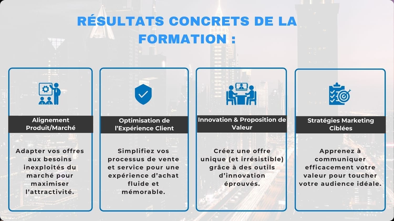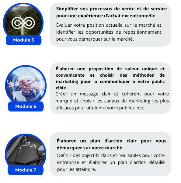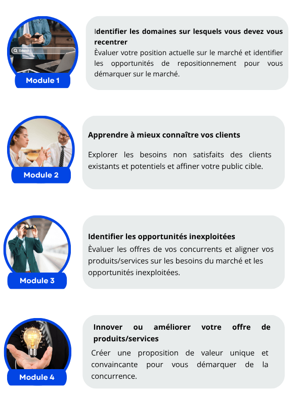 À la fin du cours, vous aurez acquis les compétences nécessaires pour évaluer votre position actuelle sur le marché, identifier les opportunités de repositionnement et explorer les besoins non satisfaits des clients existants et potentiels.
